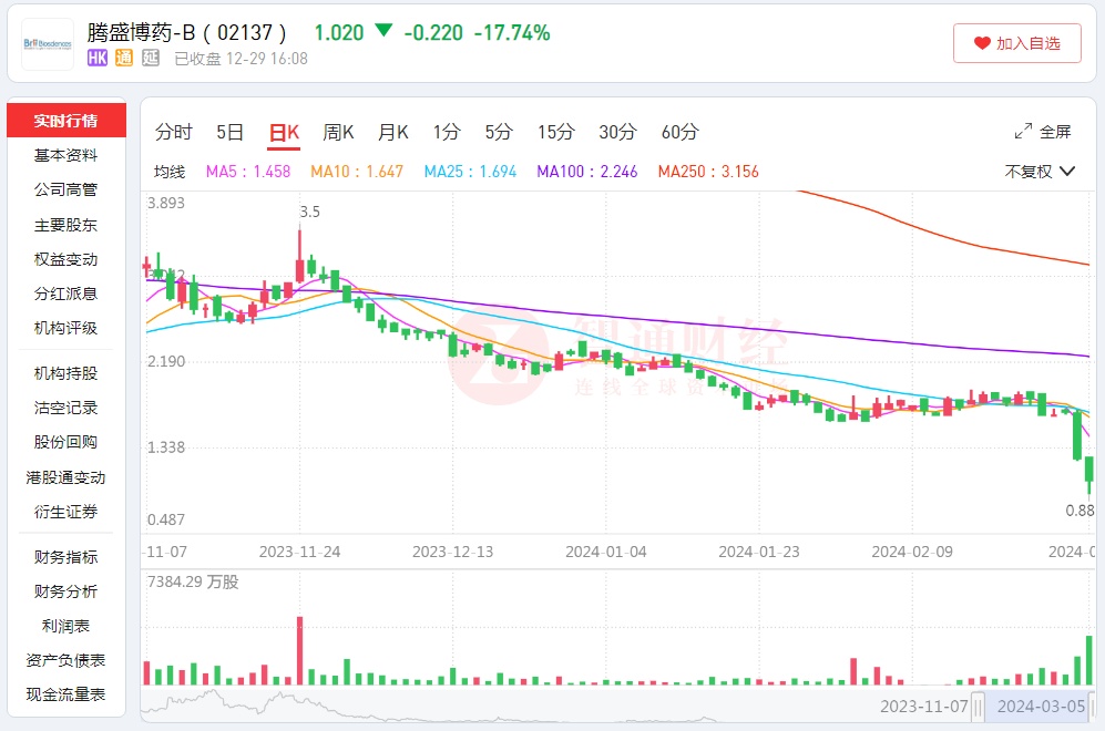 受此消息影响,腾盛博药-B(02137)接连两日大跌。4日,其股价大幅走低,大跌27.06%,近乎是剔除名单中下跌最为惨烈的一只股票。5日,其股价继续走低,盘中一度跌超28%,最终收跌17.74%至1.02港元,总市值7.442亿港元。
