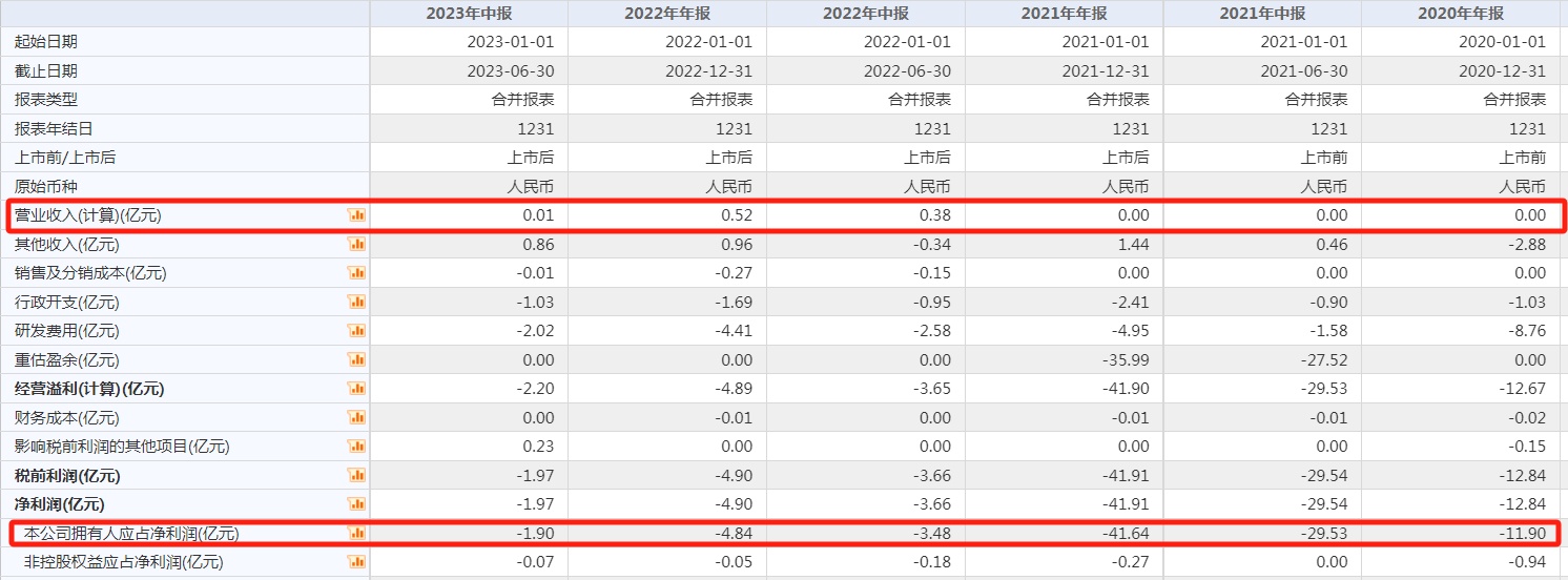 据相关财报数据显示,2020年至2022年,该公司实现营收分别为0亿元、0亿元、0.52亿元,本公司拥有人应占净亏损分别为11.90亿元、41.64亿元、4.84亿元,三年时间累计亏损约58亿元。截至2023年上半年,该公司实现营收0.01亿元,本公司拥有人应占净亏损为1.9亿元。