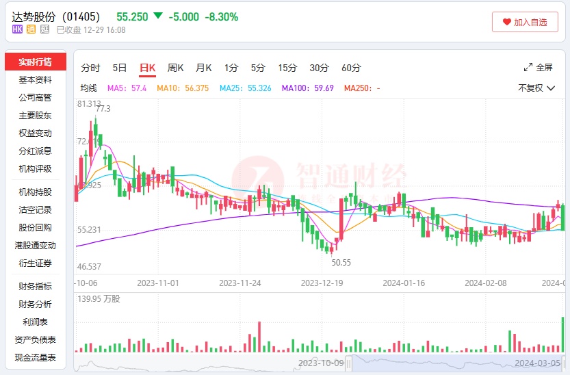 智通财经APP获悉,3月5日,达势股份(01405)收跌8.3%,报5.25港元。消息面上,3月4日,达势股份发布盈利预告,预期2023年总收入不少于人民币30亿元,同比增长不少于48%;净亏损不高于人民币2900万元,去年同期净亏损约为人民币2.2亿元;经调整净利润不少于人民币800万元,而2022财年则录得经调整净亏损。此外,3月4日,根据上海证券交易所和深圳证券交易所发布的港股通标的调整公告,达势股份遭剔除出港股通名单,3月4日起生效。