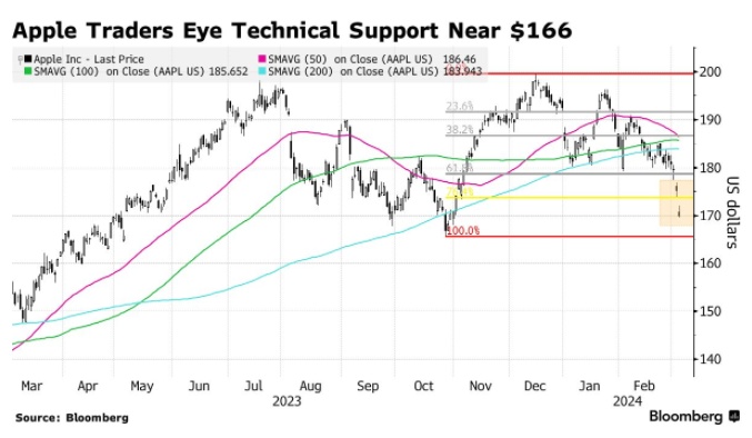 智通财经APP获悉,周二,苹果(AAPL.US)股价跌破重要心理关口,自去年8月以来首次进入技术性调整,交易员正密切关注该股走势。