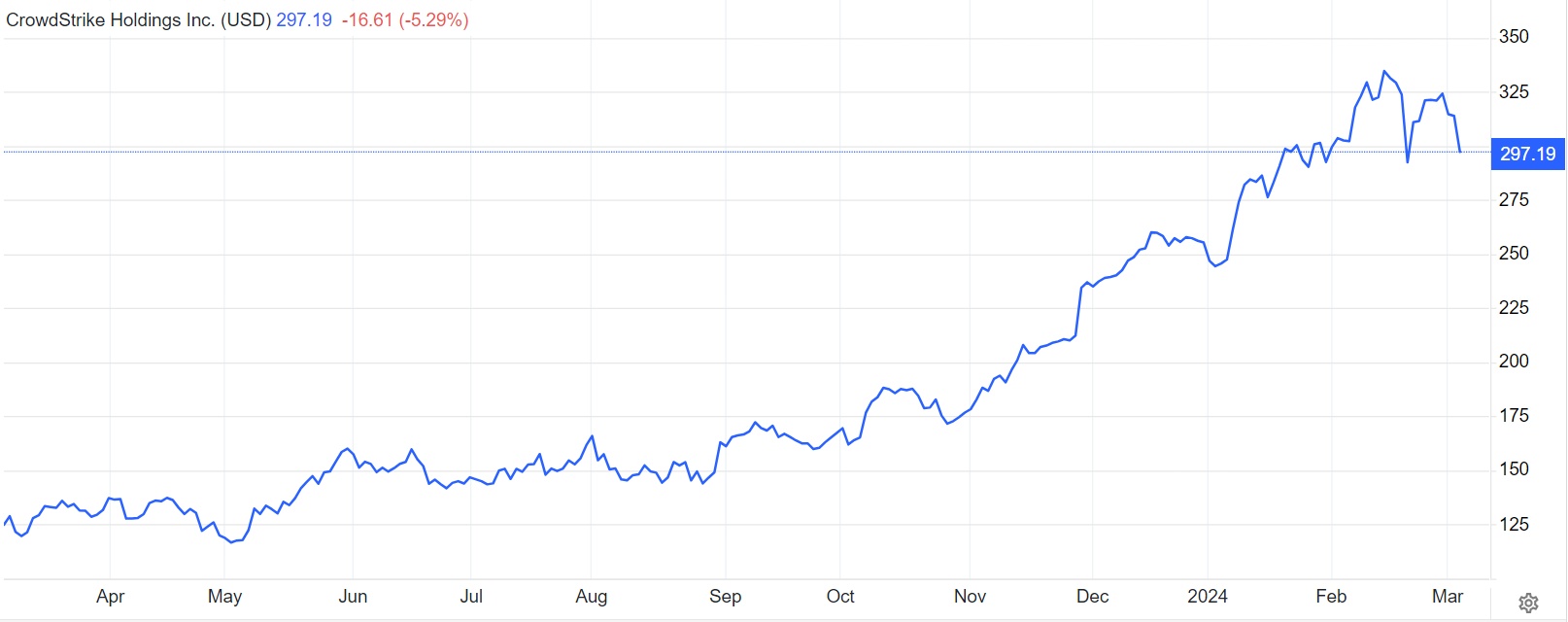 统计数据显示,继2023年暴涨超140%之后,美股“AI大牛股”之一的CrowdStrike的股价今年迄今的涨幅高达16%,主要因为投资者希望全球企业在网络安全方面的投资将继续飙升,以及期望将AI技术融入网络安全领域的CrowdStrike估值趁着全球AI投资狂潮持续提升。