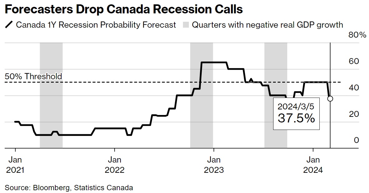 接受调查的经济学家预计,加拿大央行将在6月份首次降息,随后的宽松政策将使政策利率在2025年底前降至3%。隔夜掉期交易交易员认为,加拿大央行在4月会议上降息的几率约为三分之一,而首次全面降息25个基点的预期是在7月。
