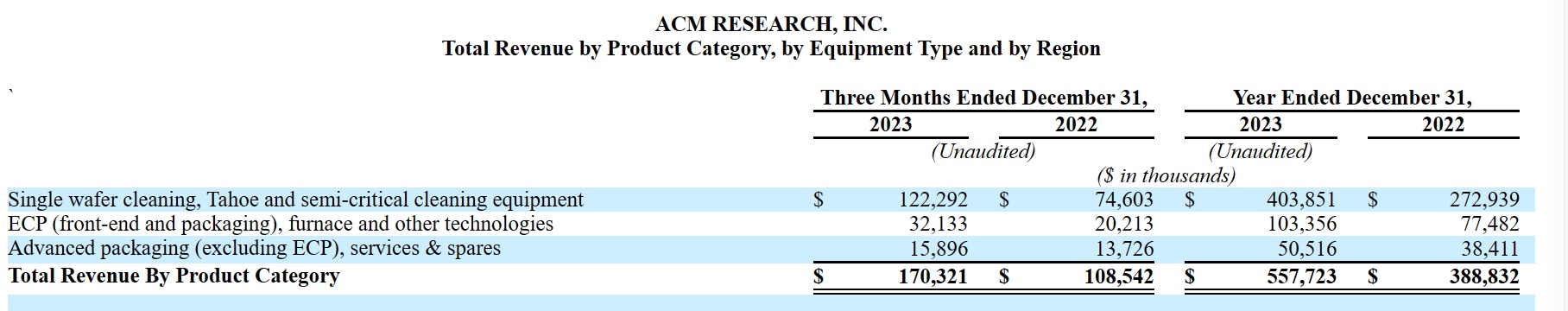 在2023年,ACM Research半导体清洗设备的收入为4.04亿美元,同比增长47.96%;其他设备(电镀、立式炉管、无应力抛铜等)的收入为1.03亿美元,同比增长33.40%;先进封装相关的收入为5051.60万美元,同比增长31.51%。产品收入多元化趋势明显。