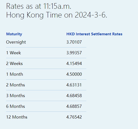 智通财经APP获悉,3月6日,港元拆息多数偏软,一周拆息跌穿4%,报3.99357%,但隔夜息微升至3.701077%。与楼按相关的一个月拆息维持4.5%,续创2月23日以来最高。反映银行资金成本的三个月拆息回落至4.68458%,与同期美元LIBOR息差略为收窄至90基点。
