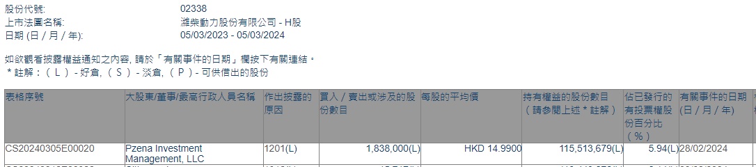 智通财经APP获悉,香港联交所最新资料显示,2月28日,Pzena Investment Management,LLC减持潍柴动力(02338)183.8万股,每股作价14.99港元,总金额约为2755.16万港元。减持后最新持股数目约为1.16亿股,最新持股比例为5.94%。