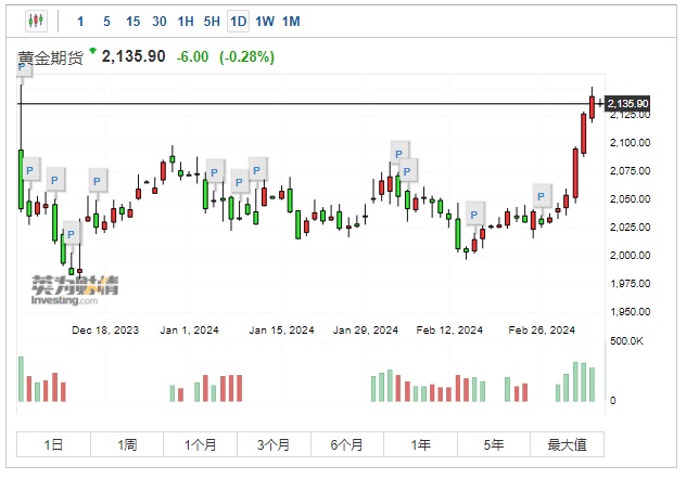 智通财经APP获悉,随着市场对美联储6月降息预期升温、地缘政治紧张局势和股市回调风险的共同推动下,金价已经起飞。数据显示,国际黄金期货最新突破每盎司2135美元。港股二级市场上,3月6日,港股黄金股延续涨势,截至收盘,紫金矿业(02899)涨6.17%,报14.10港元;山东黄金(01787)涨2.03%,报14.10港元;灵宝黄金(03330)涨1.56%,报1.95港元;招金矿业(01818)涨1.43%,报9.22港元。