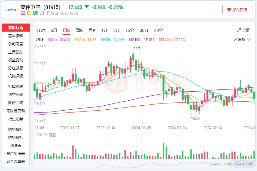 消息面上,高伟电子的重要客户苹果公司近期遭遇了一系列利空。首先,欧盟对苹果的反垄断罚款达到18亿欧元,这是苹果首次面临此类处罚,也是欧盟对科技公司的重罚之一。其次,由于担忧苹果主要产品需求疲软,及其股价表现不佳,高盛将苹果从最佳买入公司名单中除名。同时,苹果公司还被投行Evercore ISI从战术跑赢榜单中除名。
