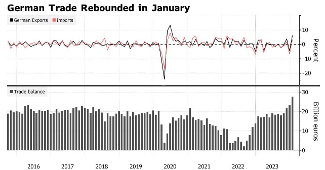 智通财经获悉,今年年初,德国出口大幅增长,这一迹象可能表明,拖累欧洲最大经济体的工业疲软可能正在缓解。德国1月季调后出口环比增长6.3%,远超预期1.5%,而上个月为下降4.6%。德国1月进口环比增速也超过预期达到3.6%,而上个月为下降6.7%;尽管如此,德国1月贸易顺差仍扩大到275亿欧元(300亿美元),或创下记录。