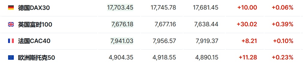 2.截至发稿,德国DAX指数涨0.06%,英国富时100指数涨0.39%,法国CAC40指数涨0.10%,欧洲斯托克50指数涨0.23%。