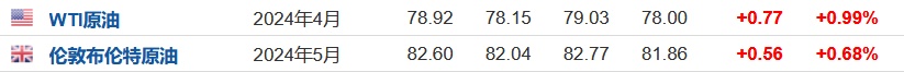 3.截至发稿,WTI原油涨0.99%,报78.92美元/桶。布伦特原油涨0.68%,报82.60美元/桶。