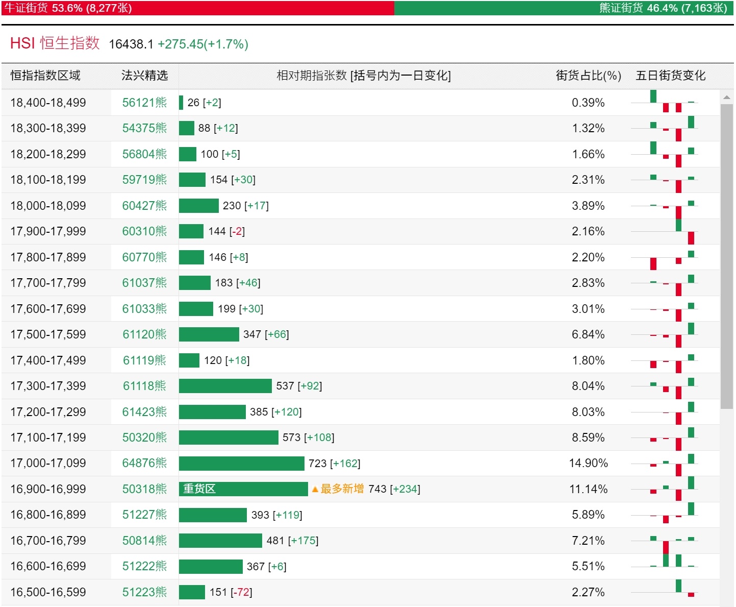 法兴恒指牛熊证街货分布图中的数据显示,熊证街货重货区和最多新增都在16900-16999区间,该区间最新熊证数量为743张,较上一交易日增加234张。