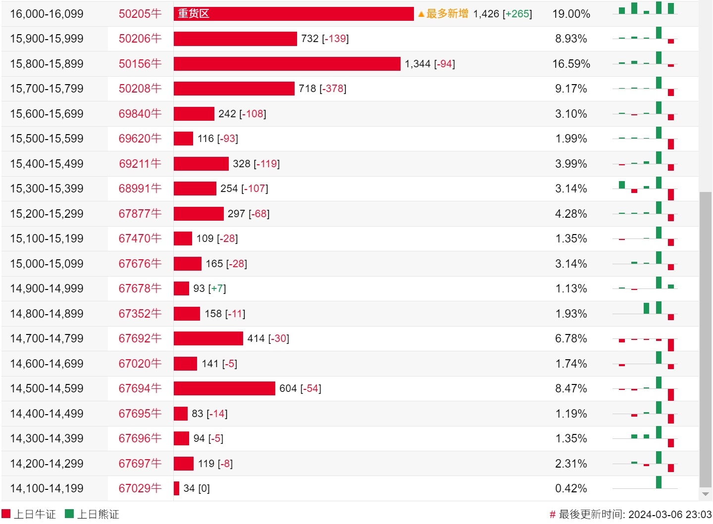 牛证街货重货区和最多新增都在16000-16099区间,该区间最新牛证数量为1426张,较上一交易日增加265张。