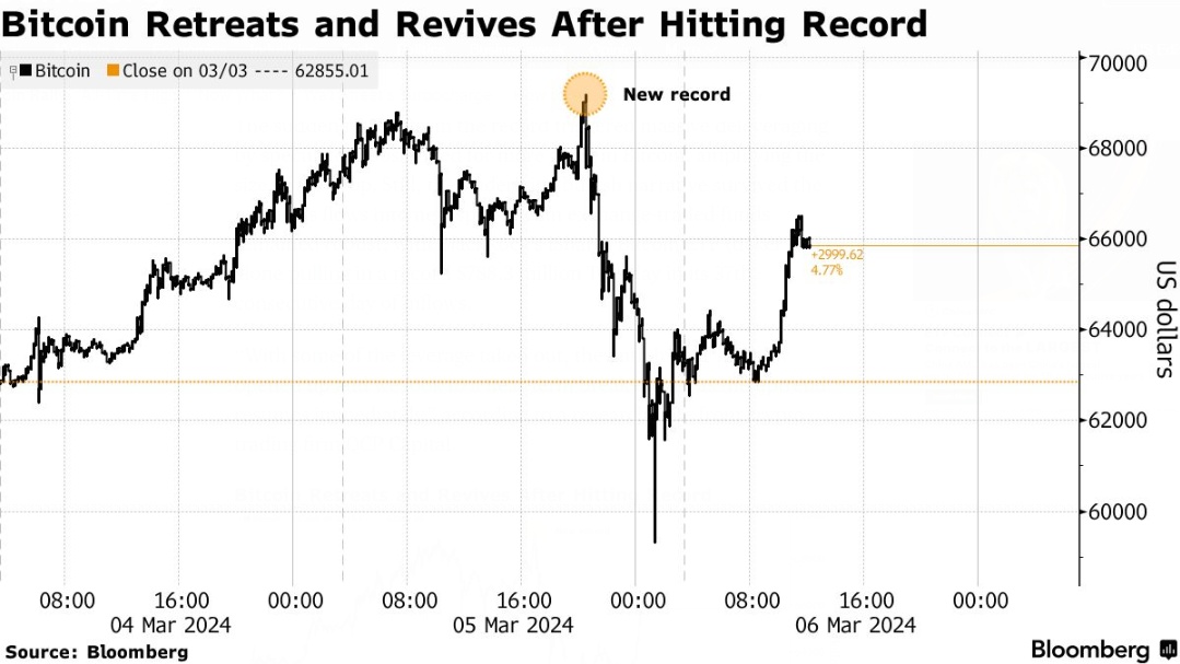 这种最古老、最大的代币周三在一度上涨了5.8%,达到67,002.84美元,带动了整个数字资产市场的上涨。然而就在一天前,比特币曾触及历史最高点69,191.95美元,然后迅速回落至60,000美元以下。据数据显示,周二高点和低点之间超过14%的幅度,是今年比特币价格最大的波动范围。