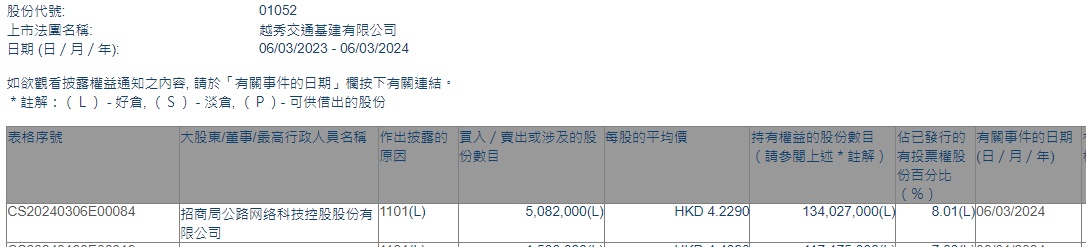 智通财经APP获悉,香港联交所最新资料显示,3月6日,招商公路增持越秀交通基建(01052)508.2万股,每股作价4.2290港元,总金额约为2149.18万港元。增持后最新持股数目为1.34亿股,最新持股比例为8.01%。