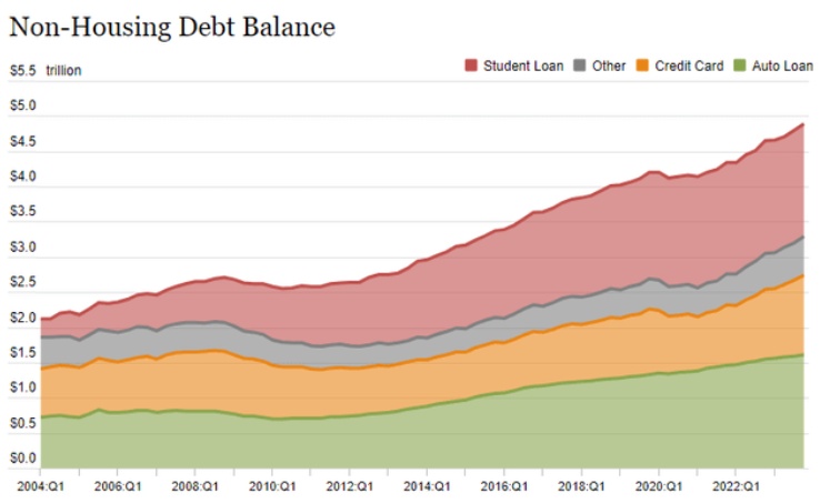 因此,我们可以在这里看到一些重要的事情:名义债务数字并不是全貌。随着2022年期间通货膨胀率不断上升,债务人获得了差额,因为他们能够在通货膨胀率飙升之前花钱,并且正在用购买力不断下降的通货膨胀率飙升后的美元偿还贷款。而且不仅仅是与住房相关的债务在上升。