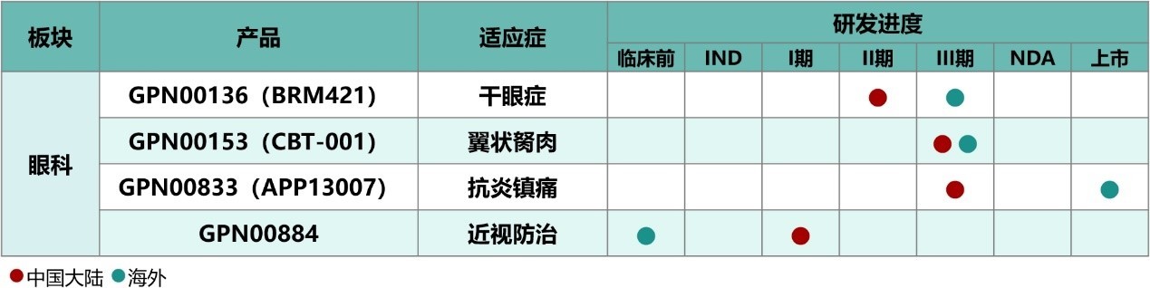 GPN00833海外II期临床研究和两项III期临床研究均已成功达到临床终点,临床结果显示,该产品在治疗眼科术后抗炎和镇痛方面有着显著的有效性,且安全性良好,近90%的患者在手术之后完全没有疼痛,约60%的患者在眼科手术后15天内完全没有炎症反应。GPN00833已于2023年4月在国内获批开展III期临床研究,并已完成首例患者入组给药。