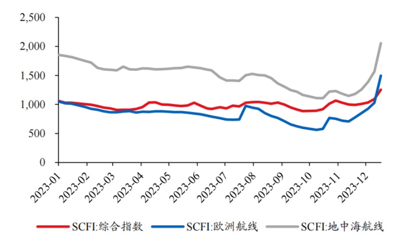 受红海危机影响,去年12月18日,HMM和阳明海运宣布避过苏伊士运河,绕道南非好望角或在安全地点等待。至此,占全球运力约82%(Alphaliner2023年12月数据)的前九名班轮公司均暂停红海通行。在此背景下,SCFI(上海出口集装箱运价指数)去年12月22日收于1255点,周环比+14.8%,其中欧线大涨46%。