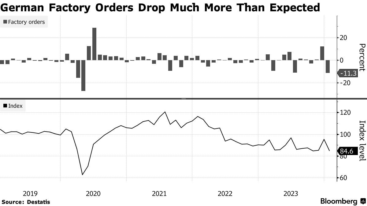 智通财经APP获悉,周四公布的数据显示,德国1月工业订单环比下降11.3%,远超市场预期的环比下降6%,且低于上月的环比增长12%。德国统计局表示,下降是由于主要订单放缓,在去年12月的强劲表现之后,这些订单已恢复至正常水平。这一数据突显出欧洲最大经济体在克服近期低迷时所面对的困难。