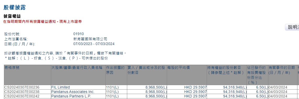 智通财经APP获悉,香港联交所最新资料显示,3月4日,富达国际增持新秀丽(01910)896.85万股,每股作价29.5907港元,总金额约为2.65亿港元。增持后最新持股数目约为9431.89万股,最新持股比例为6.50%。