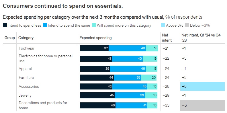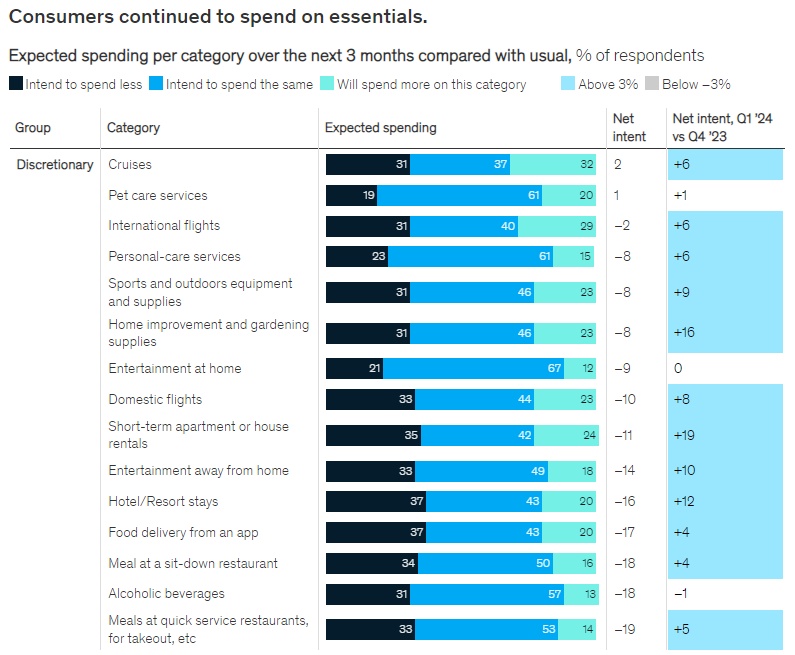 与此同时,这也凸显出服务通胀的问题——美联储最关心的通胀部分;这呼应了最近市场开始担忧的通胀粘性问题,进而会影响美联储降息,更甚至影响软着陆的预期。而若反通胀趋势放缓,消费者支出或继续遭挤压。进而在非必需品上花钱时会三思而后行,而在食品等必需消费品上则会花更多钱。