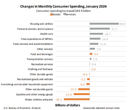 而且,在美国1月消费者支出439亿美元的增幅中,绝大部分在于服务支出增加,部分被商品支出减少所抵消,这反映出以销售商品为主的零售商们的窘况。在商品方面,唯一的增长类别为食品。