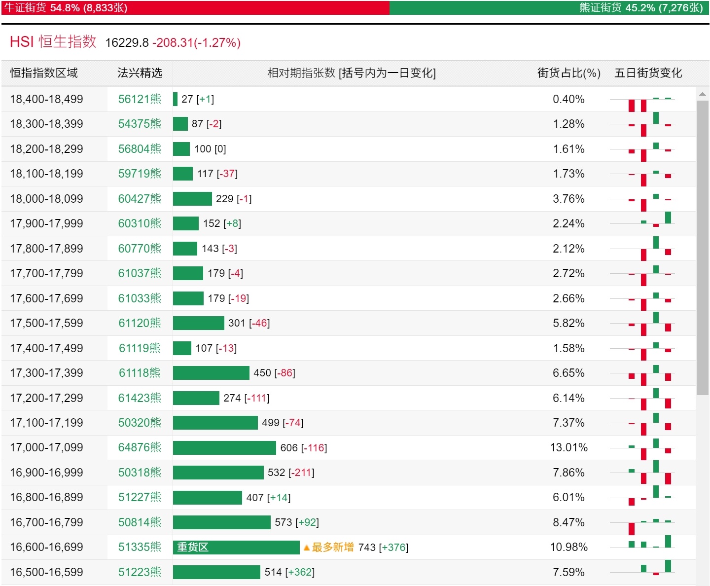 法兴恒指牛熊证街货分布图中的数据显示,熊证街货重货区和最多新增都在16600-16699区间,该区间最新熊证数量为743张,较上一交易日增加376张。