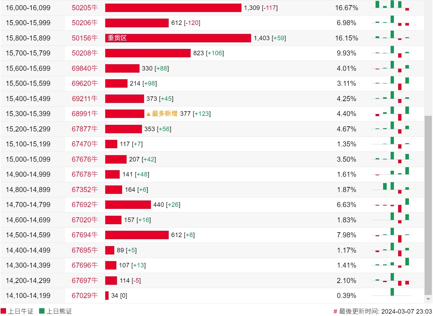 牛证街货重货区在15800-15899区间,该区间最新牛证数量为1403张,较上一交易日增加59张;最多新增在15300-15399区间,该区间最新牛证数量为377张,较上一交易日增加123张。
