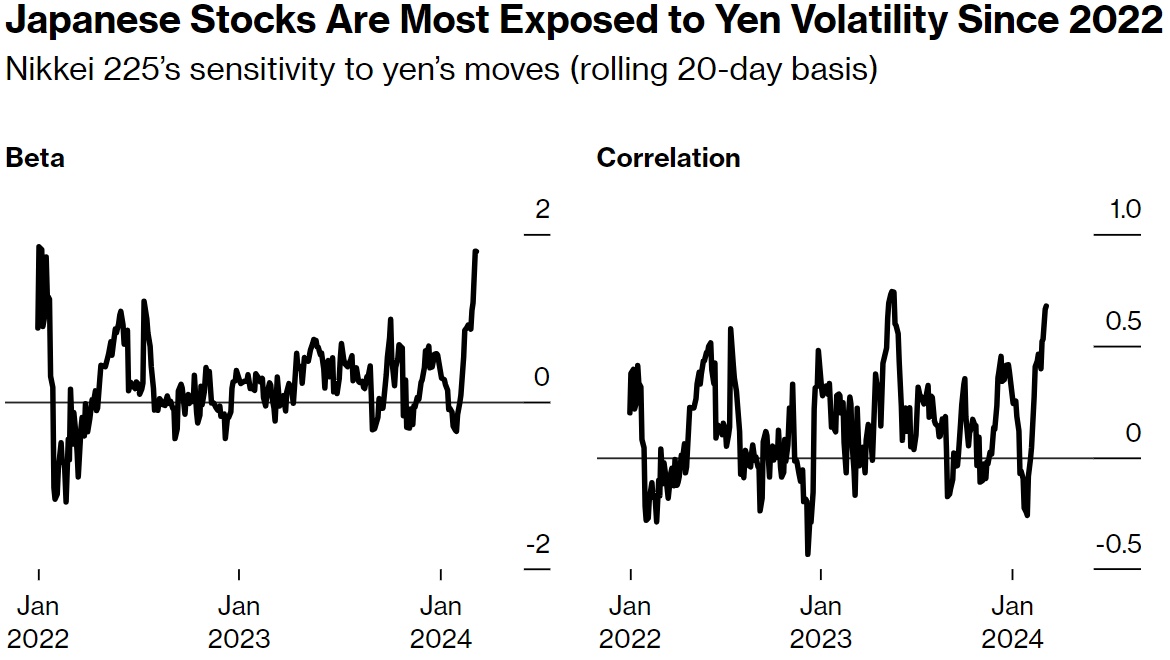衡量日经指数受日元走势影响程度的贝塔指数本周攀升至2022年1月以来的最高水平。数据显示,这意味着日元每升值1%,就可能引发蓝筹股指数下跌约2%。日元和日经指数之间的相关性也达到了去年5月以来的最高水平。