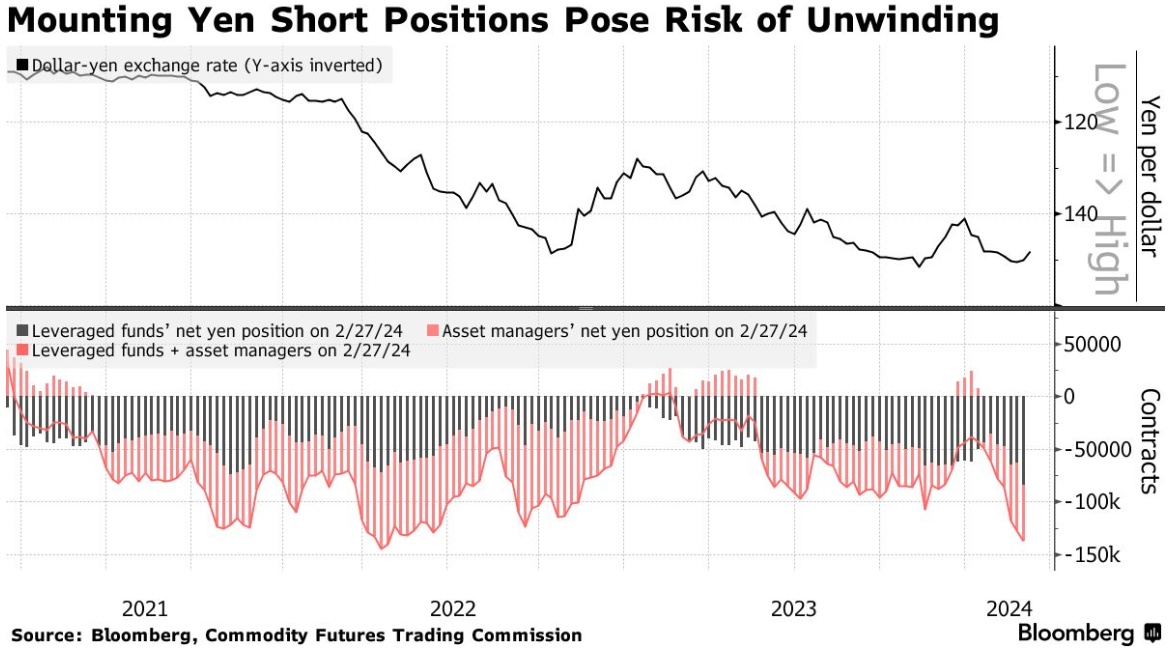 根据商品期货交易委员会的数据,对冲基金和资产管理公司持有的看跌日元头寸总额增至2022年4月以来的最高水平。分析师估计,这些头寸的平仓将加速日元的升值,预计到2024年底,日元兑美元汇率将升至139日元。