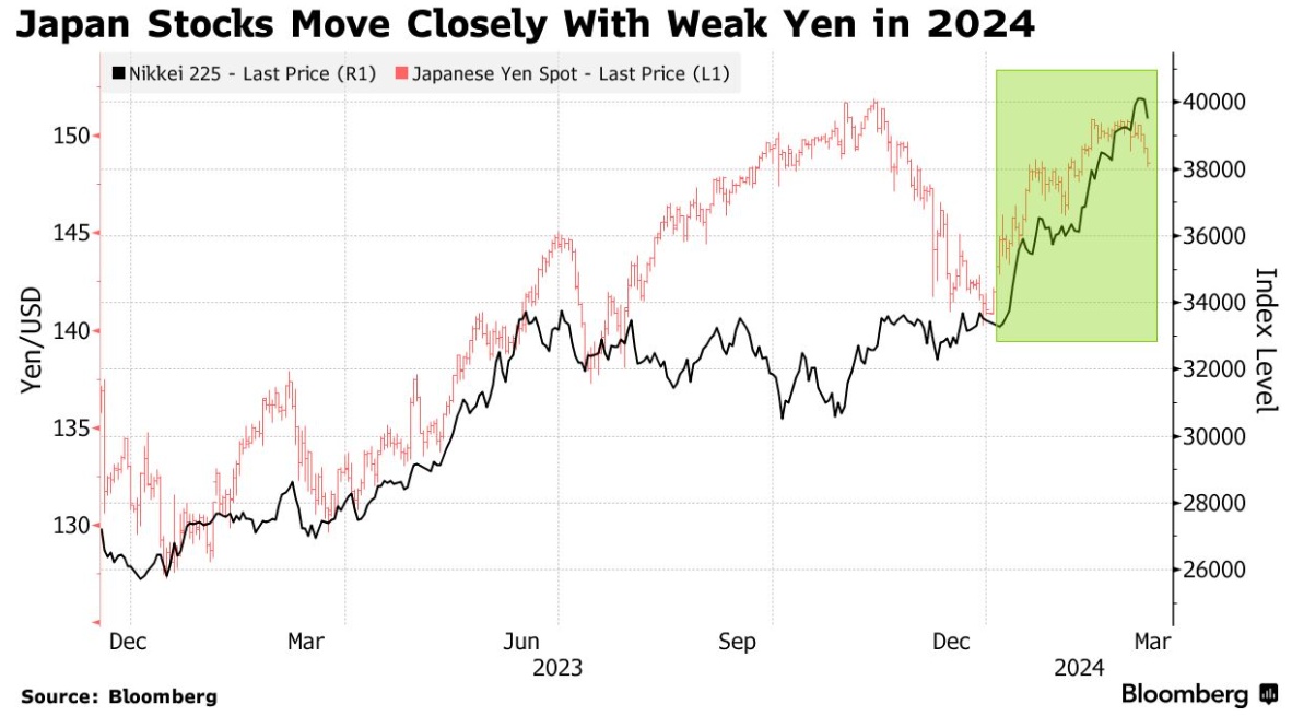 周四的市场走势凸显了这种关系:日经225指数创下一个多月来最大跌幅,原因是越来越多的人猜测日本央行将在3月18日至19日的会议上结束负利率政策,导致日元兑美元走强。