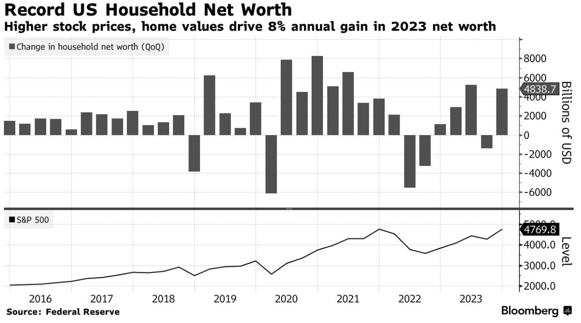 由于市场预期美联储将于今年开始降息,股市上涨,第四季度净资产较前三个月增加了4.8万亿美元,增幅为3.2%。