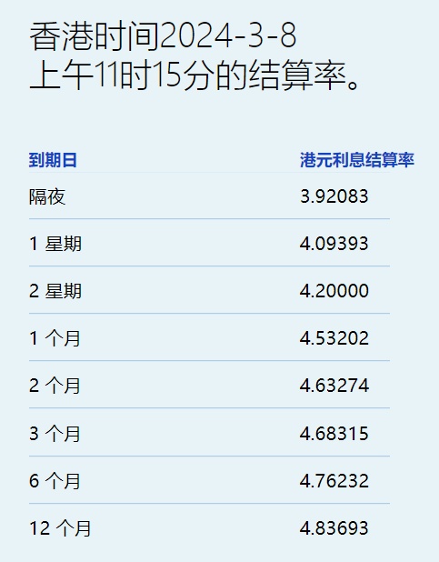 智通财经APP获悉,3月8日,港元拆息个别发展,其中,隔夜息连升三天,报3.92083%,创一周新高,一周钱升至4.09393%,而与楼按相关的一个月拆息亦报4.53202%,创逾两周新高。至于六个月及一年期拆息分别升至4.76232%和4.83693%,但反映银行资金成本的三个月拆息连跌三天,报4.68315%,与同期美元LIBOR息差维持90基点。