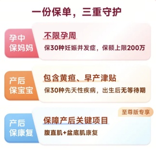 准妈妈的保障方面,保险责任内涵盖医疗报销金额最高可达200万元,包括胎盘早剥、宫外孕、羊水栓塞、子痫等30种妊娠并发症;10种妊娠期高发疾病确诊给付金最高15万元;难产(顺转剖)津贴,最高3000元;意外或疾病导致被迫终止妊娠津贴,最高3000元;值得注意的是,此次升级还特别新增最高800元的救护车保险金,如遇羊水破裂等紧急情况,能够第一时间守护准妈妈的安全。