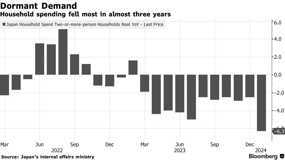 周五公布的数据显示,日本1月所有家庭支出同比下降6.3%,降幅高于市场预期的4.3%和前值2.5%,创2021年2月以来的最大同比降幅,同时也是该指标连续第11次下滑。日本1月所有家庭支出环比下降2.1%,同样不及市场预期的环比增长0.4%和前值环比下降0.9%。