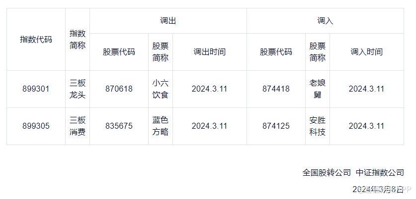 智通财经APP获悉,3月8日,中证指数公司发布关于调整三板指数样本股的公告。根据三板龙头、三板消费指数编制方案,老娘舅(874418)、安胜科技(874125)满足快速进入情形,全国股转公司与中证指数公司决定对三板龙头、三板消费的样本股做出如下调整: