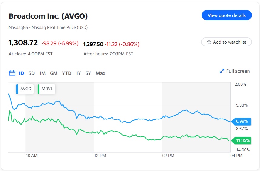 截至周四收盘,该公司股价今年累计上涨26%,但周五收跌近7%,这是自2020年3月疫情初期以来的最大单日跌幅。受疲软预测影响,同为芯片制造商、被视为人工智能支出受益者的迈威尔科技(MRVL.US)股价也大跌逾11%。