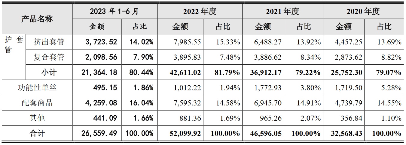 招股书披露,骏鼎达主营业务为高分子改性保护材料的设计、研发、生产与销售,主要产品包括功能性保护套管和功能性单丝等,广泛应用于汽车、工程机械、轨道交通、通讯电子等多元领域。公司主要产品凭借良好的耐温性、抗 UV 性、阻燃性、耐化学腐蚀性等性能,对各大领域的线束系统、流体管路等提供耐磨、隔热、防撞击、屏蔽、抗爆破、防火、降噪等安全防护作用。