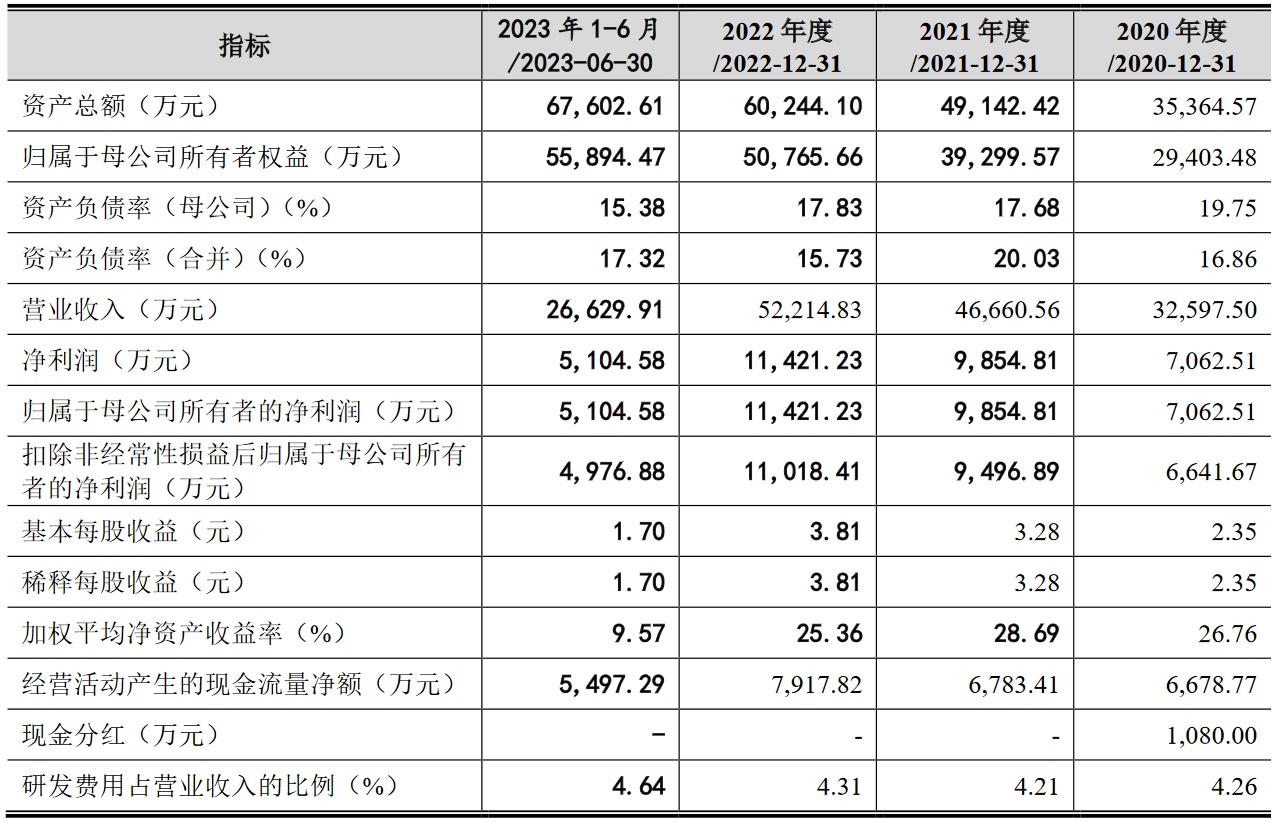 财务方面,于2020年度、2021年度及2022年度,公司实现营业收入分别约为3.26亿元、4.67亿元、5.22亿元。公司净利润分别约为7062.51万元、9854.81万元、1.14亿元人民币。