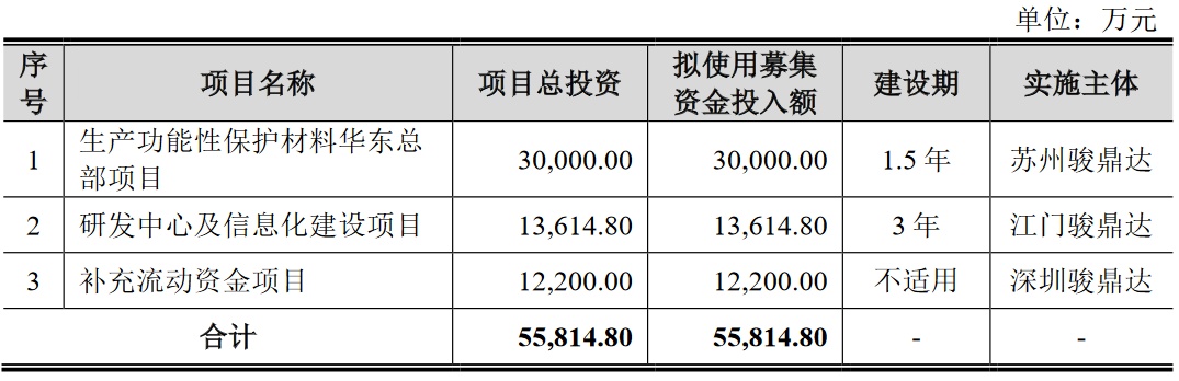 据了解,骏鼎达募集资金扣除发行费用后拟用于以下列项目:
