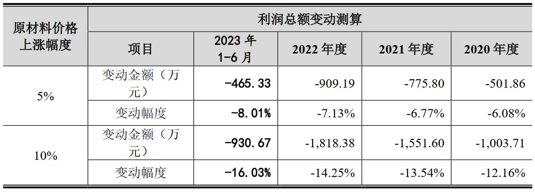 假设报告期内原材料的采购单价分别上涨5%和10%,在其他因素不变的情况下,公司利润总额的变动情况如下: