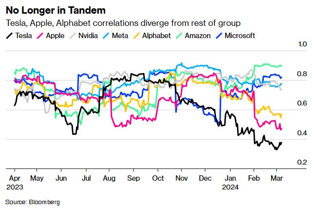 投资者对这些股票的需求让人们联想到世纪之交围绕互联网股票的投机狂潮。不过,这七只大型科技股的表现在2024年出现了分化,原因是投资者对特斯拉、苹果、Alphabet的前景感到不满,这表明围绕“七巨头”的泡沫可能已经减弱。