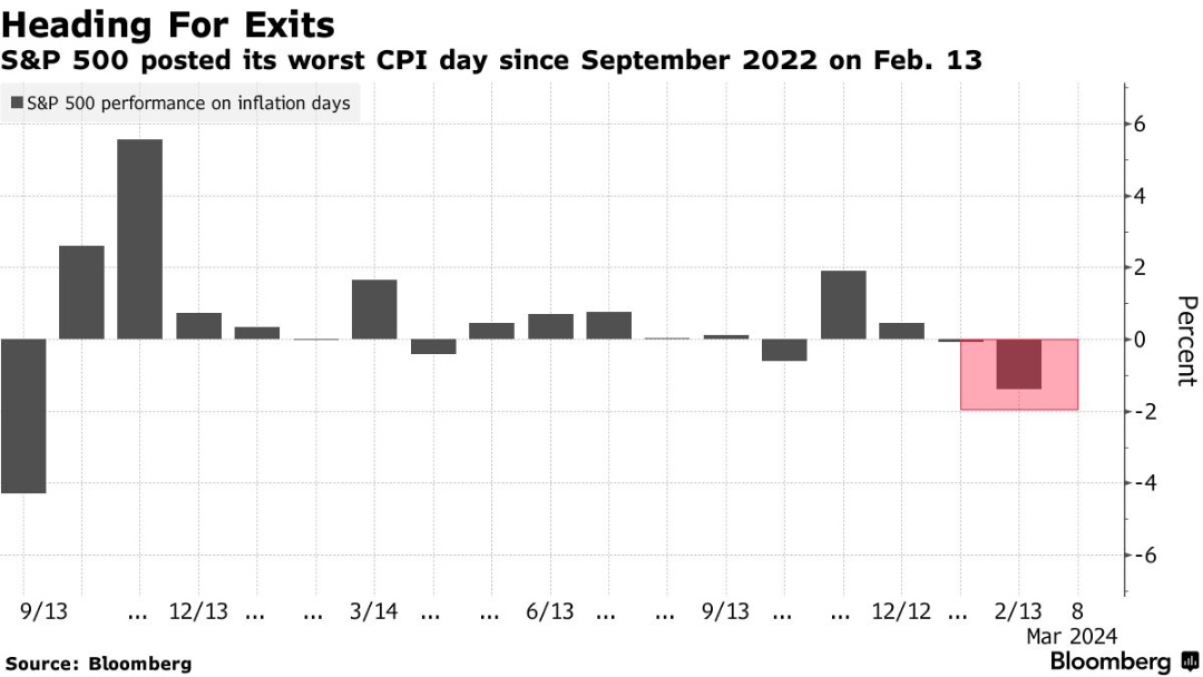 值得注意的是,许多交易员对2月公布的美国1月CPI数据记忆犹新,当时美国核心消费者价格指数创下8个月来的最高涨幅。据数据显示,这导致标普500指数下跌1.4%,这是该指数自2022年9月以来最糟糕的一天。