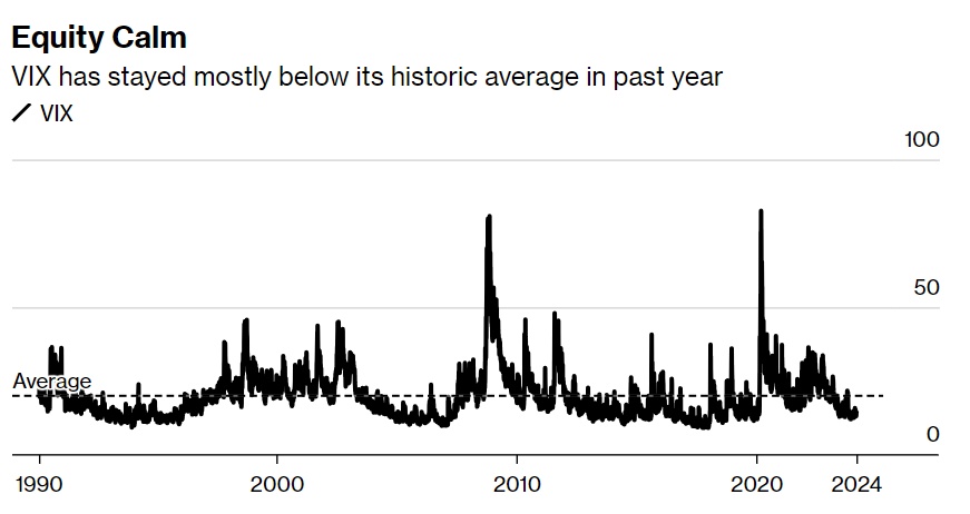目前还没有出现一种催化剂来引发危机重演。即使在巴以去年10月爆发战争,或美国公布1月份通胀高于预期的时候,市场仍保持平静。波动率指数(VIX)近5个月来一直低于20的历史平均水平,自2018年以来,这一休眠状态仅被打破过两次。