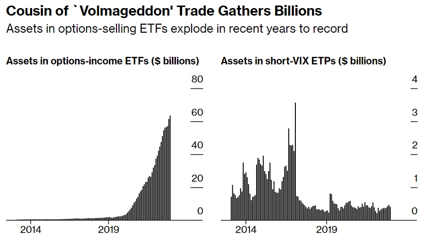 它们的新形式主要采用ETF的形式,出售股票或指数的期权,以提高回报。Global X ETFs编制的数据显示,这类产品的资产在两年内几乎翻了两番,达到创纪录的640亿美元。2018年,他们的短波动性同行——一小群直接押注预期波动的基金——在崩溃前只有大约21亿美元。
