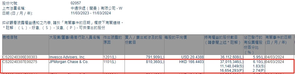 智通财经APP获悉,香港联交所最新资料显示,3月4日,小摩增持中通快递-W(02057)81.0360万股,每股作价166.4403港元,总金额约为1.35亿港元。增持后最新持股数目约为3701.53万股,最新持股比例为6.10%。