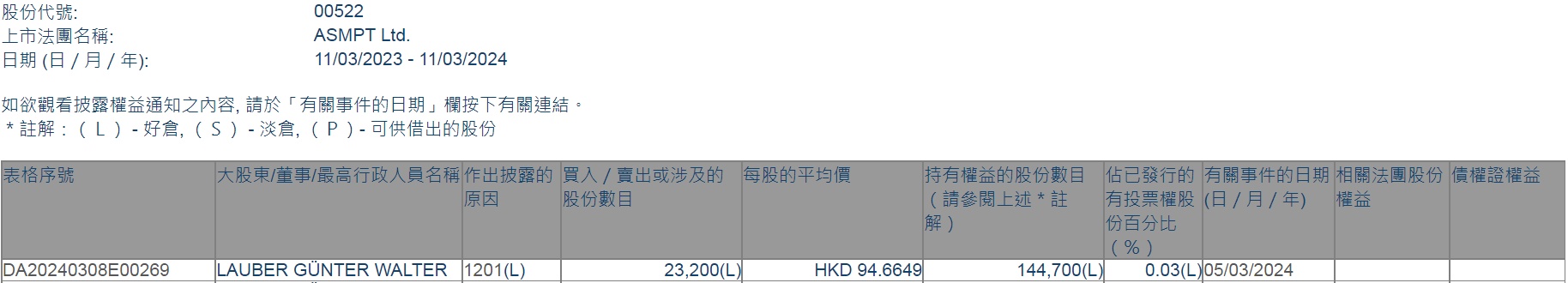 智通财经APP获悉,香港联交所最新资料显示,3月5日,LAUBER GÜNTER WALTER减持ASMPT(00522)2.32万股,每股作价94.6649港元,总金额约为219.62万港元。减持后最新持股数目约为14.47万股,最新持股比例为0.03%。