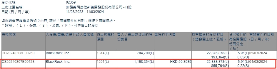 智通财经APP获悉,香港联交所最新资料显示,3月4日,贝莱德减持药明康德(02359)116.8354万股,每股作价50.3989港元,总金额约为5888.38万港元。减持后最新持股数目约为2288.89万股,最新持股比例为5.91%。
