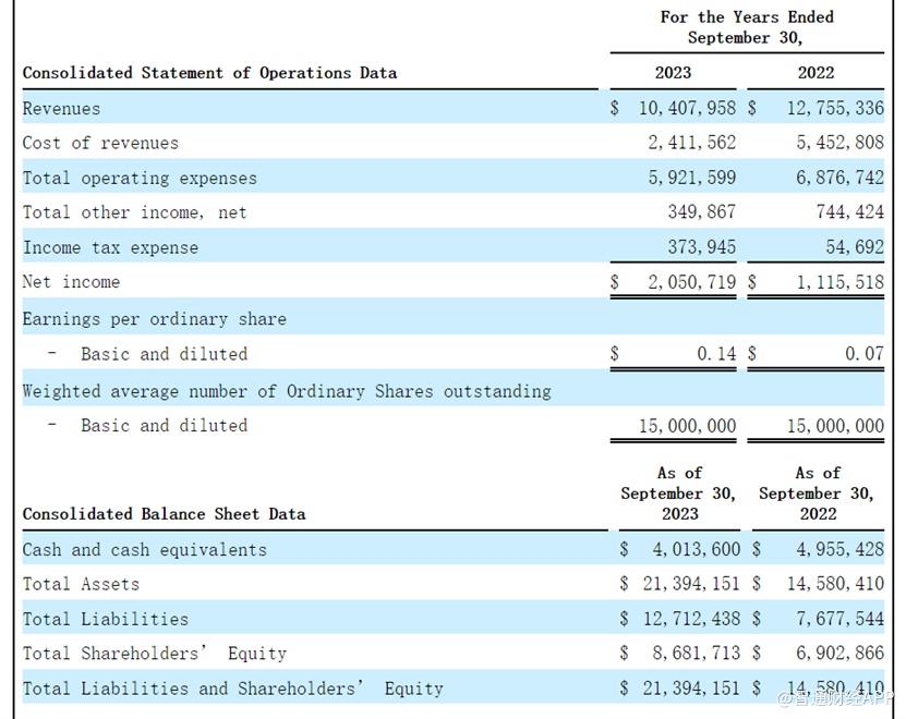根据招股书披露,截至2023年9月30日的12个月内,全球家精选实现营收1040万美元,相较去年同期的1280万美元同比下降18.8%,净收入约为210万美元,相较去年同期的110万美元同比上涨90.9%。