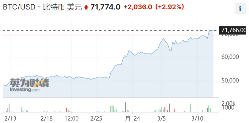 在欧洲交易中,比特币上涨了4.8%,达到创纪录的71,677美元,使今年迄今为止的涨幅达到70%。
