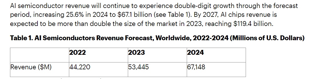 根据市场研究机构Gartner最新预测,到2024年AI芯片市场规模将较上一年增长 25.6%,达到671亿美元,预计到2027年,AI芯片市场规模预计将是2023年规模的两倍以上,达到1194亿美元。